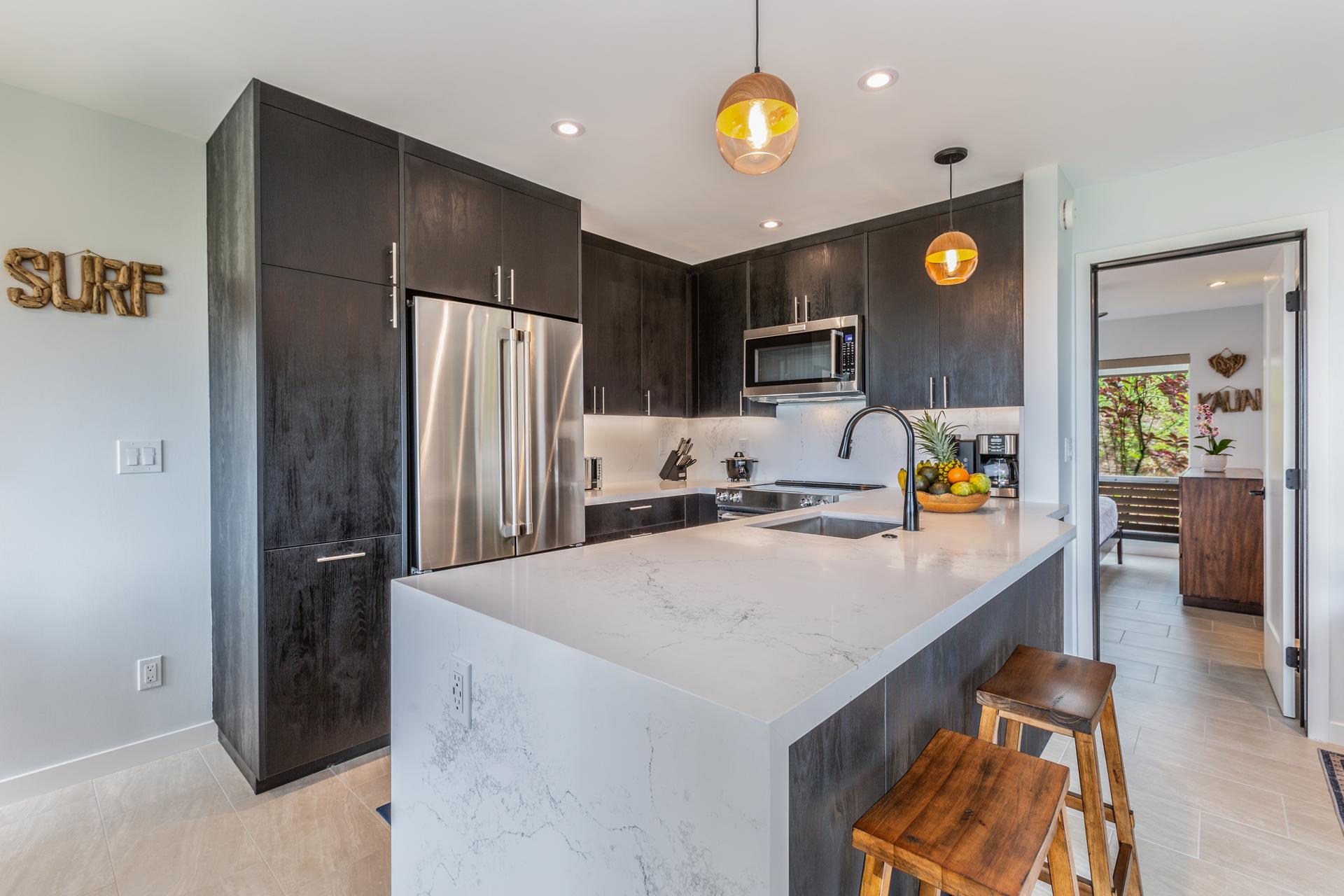 Enjoy the comforts of home with Quartzite counter tops, a fully equipped new kitchen, featuring Café refrigerator, KitchenAid oven and dishwasher. A new washer and dryer, cable TV and free high speed internet access. Ground floor condo offers easy access to bluff and private path to Hideaways Beach.
