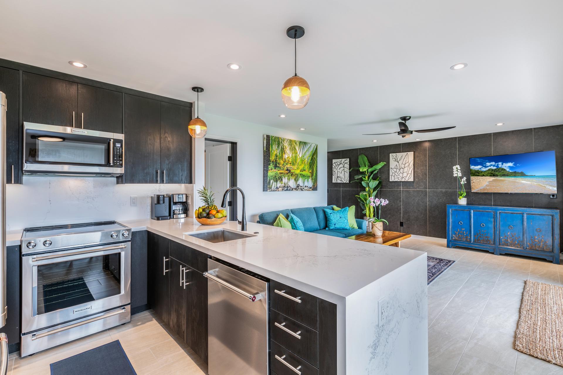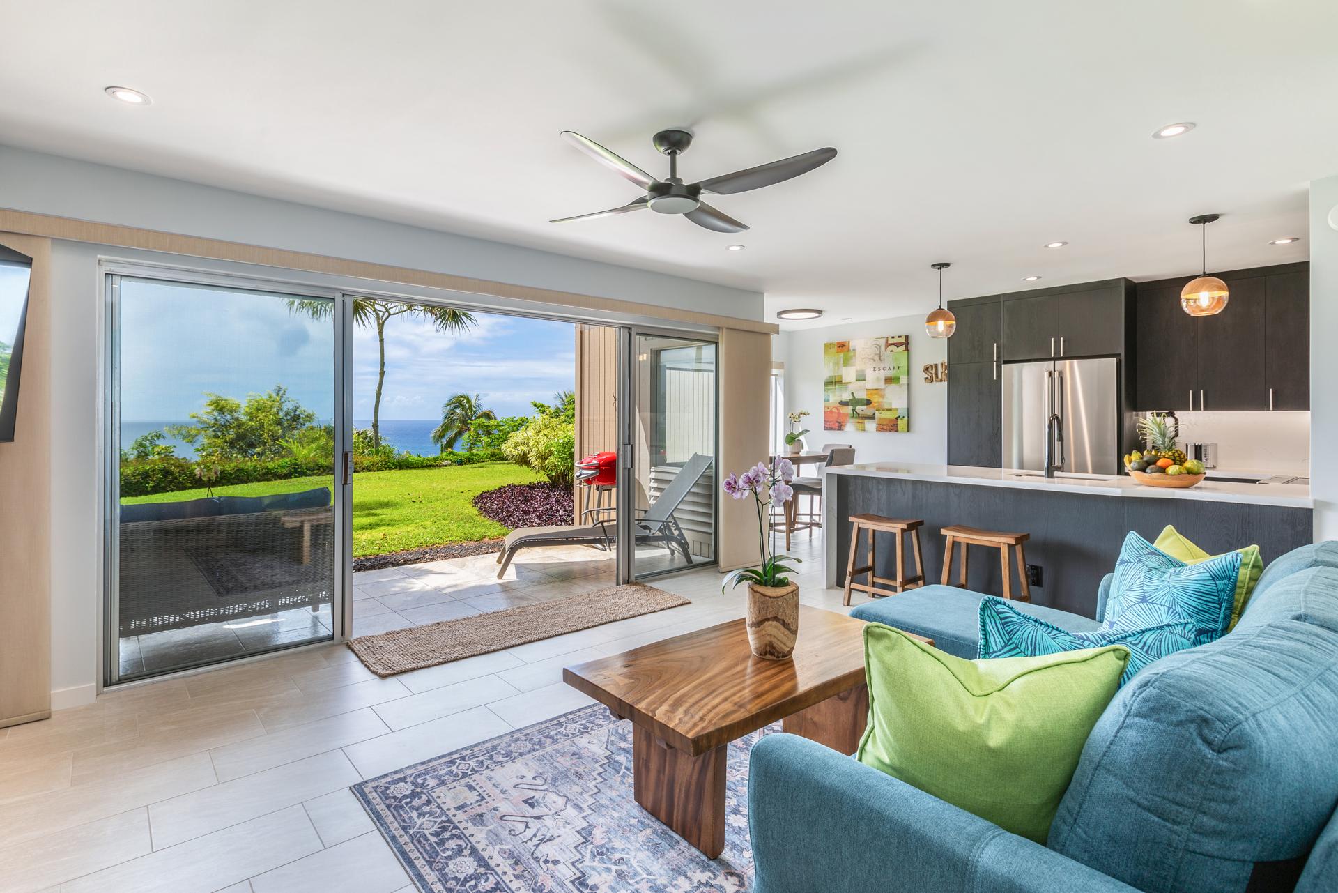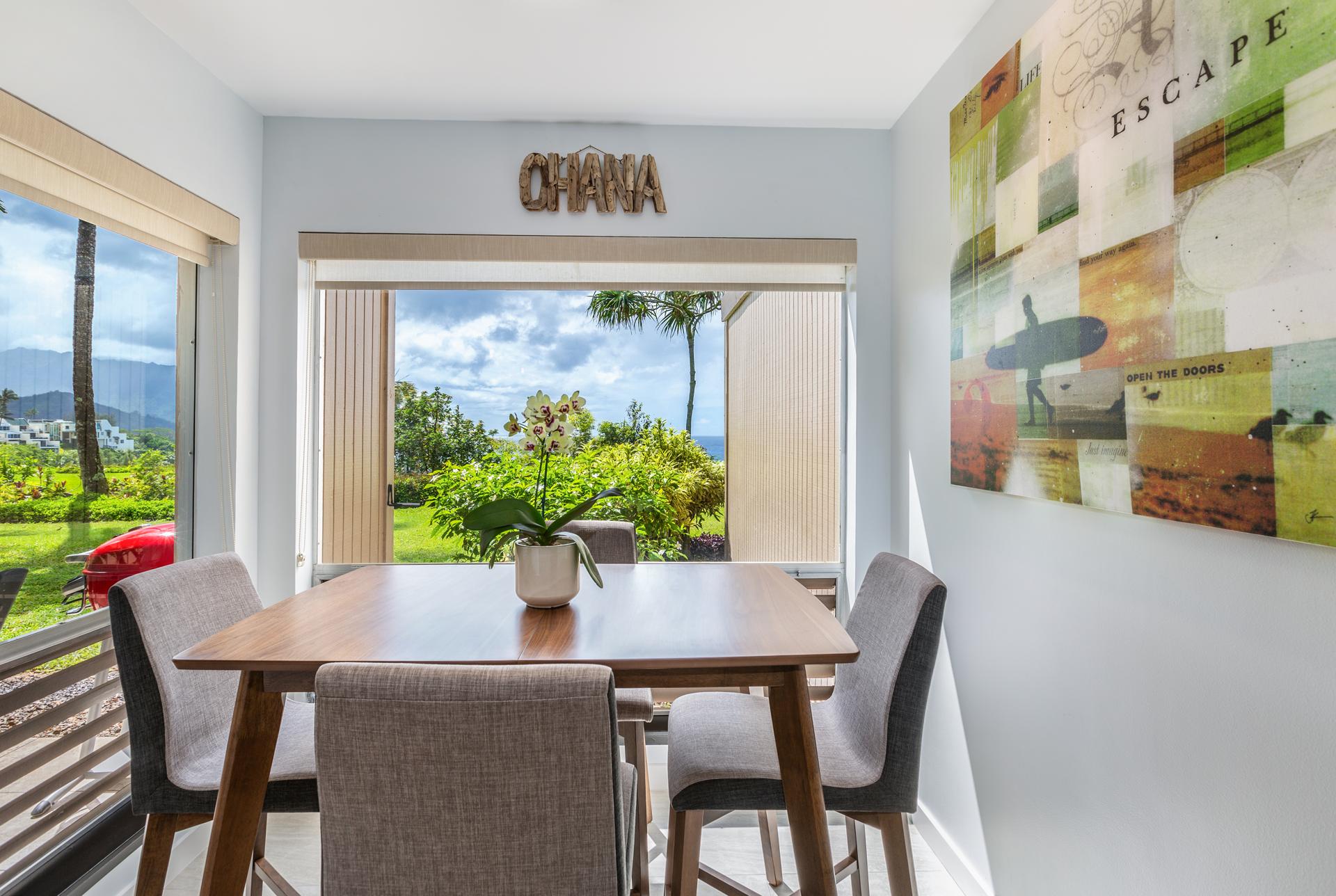 This condo has been completely renovated and is absolutely beautiful! Perfect honeymoon or romantic retreat. This bright and sunny, Kaua’i vacation rental has island style, open concept living room, dining room and kitchen and private lanai with amazing ocean and Bali Hai views.
