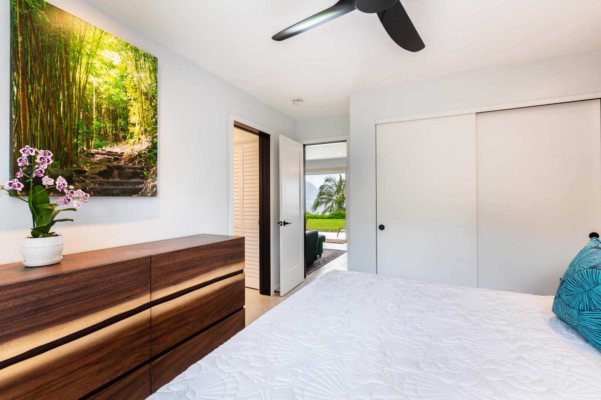 Additional amenities include: close to Napali Coast, close to 1 Hotel Hanalei Bay, beach chairs, beach towels, outdoor shower, beach umbrella, coffee maker, cookware, washer & dryer, free WiFi, cd player, close to town, beach, nearby grocery, post office, nearby post office, washer & dryer, ironing board, near beach, oceanfront, bike rentals, nearby Fedex, yoga, shopping/dining, very near Makai golf club, golf course, nearby internet cafe, mailing and business center, nearby bank, nearby medical services, Bali Hai view, Hanalei Bay, nearby ATM, barbecue grills.
