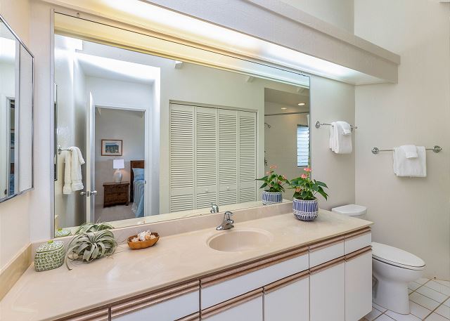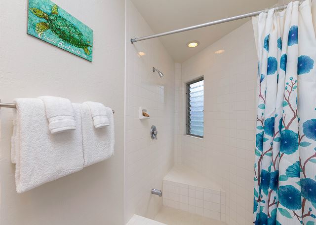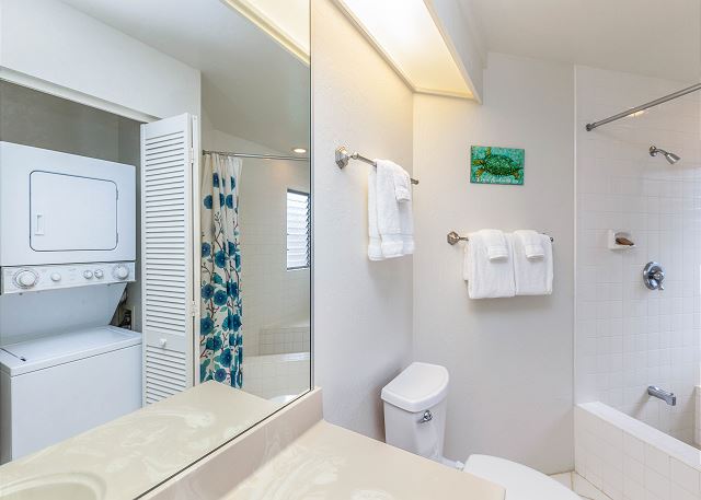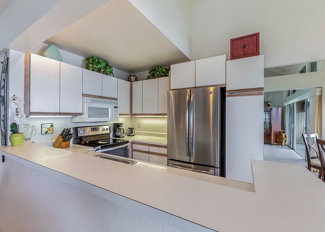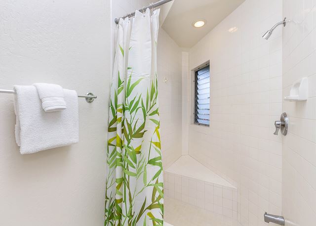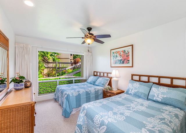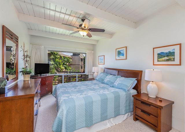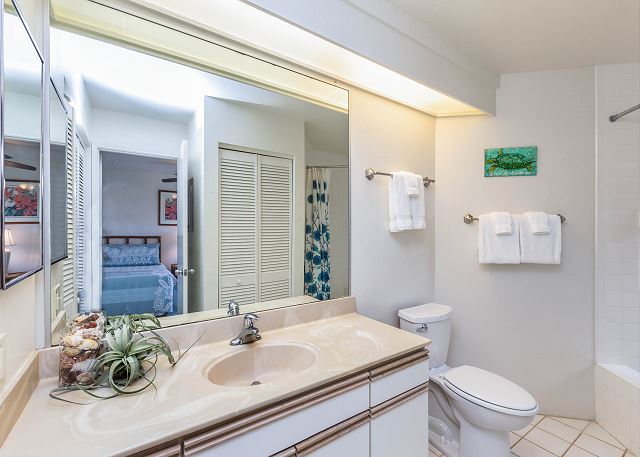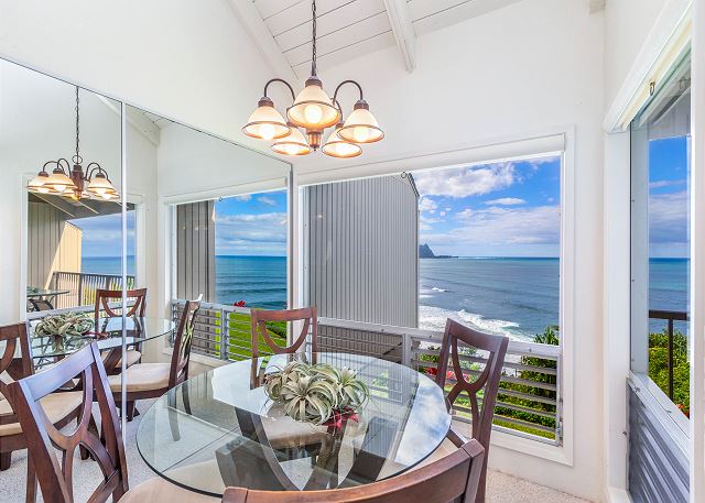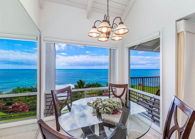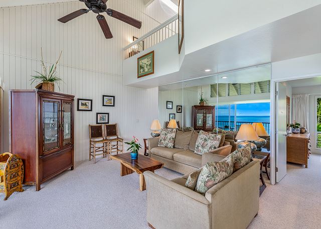 Spacious two bedroom Kaua’i vacation rental is large enough for a family but its romantic ocean and Bali Hai views are also perfect for honeymooners and couples seeking a romantic holiday! Relax and enjoy panoramic Bali Hai sunsets and seasonal whale watching (December through May) from your private lanai.