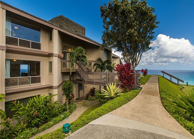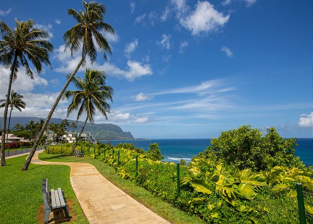 Pali Ke Kua is located on an oceanfront bluff overlooking the beautiful blue Pacific Ocean, legendary Bali Hai and Hideaways Beach. This Kauai vacation rental resort is situated on acres of lush, tropical landscaping on Kauai’s North Shore in the Princeville Resort. The view is incredible! It is one that will stay with you for a lifetime. Pali Ke Kua resort grounds have mature landscaping that is beautiful, tropical and lush. You will find many great backdrops for vacation picture taking!
