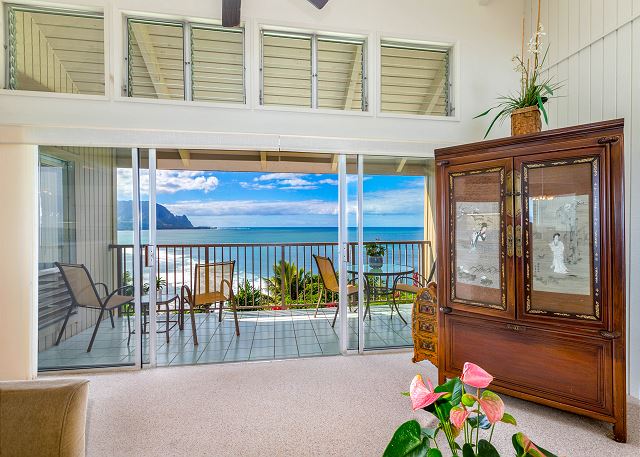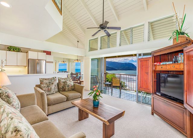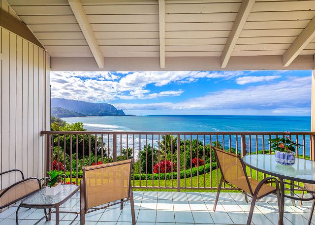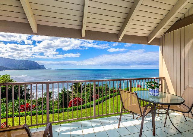 Pali Ke Kua has bright sunny rooms facing makai (towards the ocean) to feature Kauai’s incredible North Shore Hawaiian Pacific Ocean views. Kauai has wonderful trade winds and Pali Ke Kua’s Hawaiian style architecture is designed to capture these natural Island breezes to keep you comfortable. You can watch surfers & even spot whales in season from your large, private lanai (open-sided veranda, patio or porch) that looks out over the ocean. Enjoy morning coffee or sunset cocktails while enjoying breathtaking views.