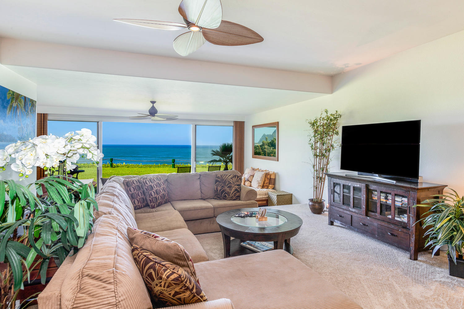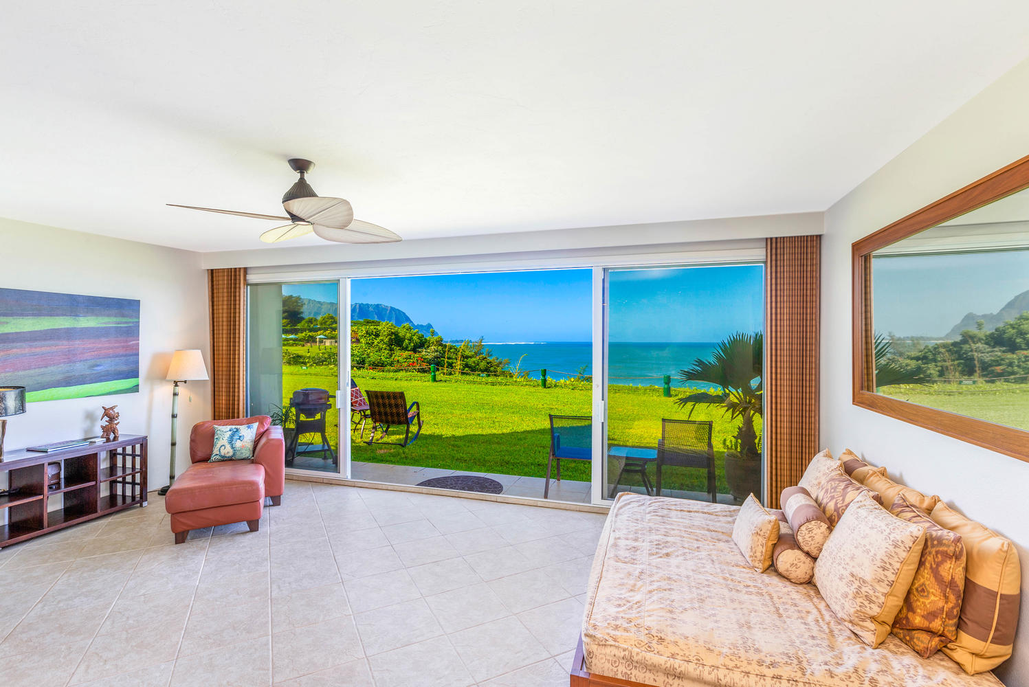 Gorgeous, beautifully renovated, extra large oceanfront Princeville Kaua’i vacation rental is spacious with over 2000 square foot interior and 36 feet of unobstructed full oceanfront glass to take in the incredible ocean and Bali Hai views. Desirable ground floor access to an acre of manicured lawn, oceanfront swimming pool and lounge area.