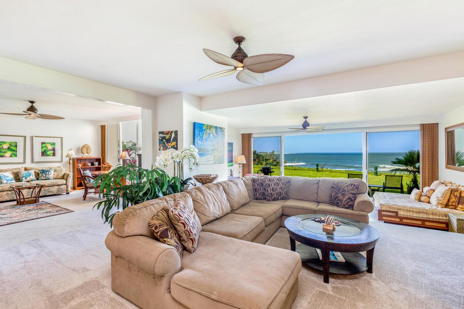 Gorgeous, beautifully renovated, extra large oceanfront Princeville Kaua’i vacation rental is spacious with over 2000 square foot interior and 36 feet of unobstructed full oceanfront glass to take in the incredible ocean and Bali Hai views. Desirable ground floor access to an acre of manicured lawn, oceanfront swimming pool and lounge area.