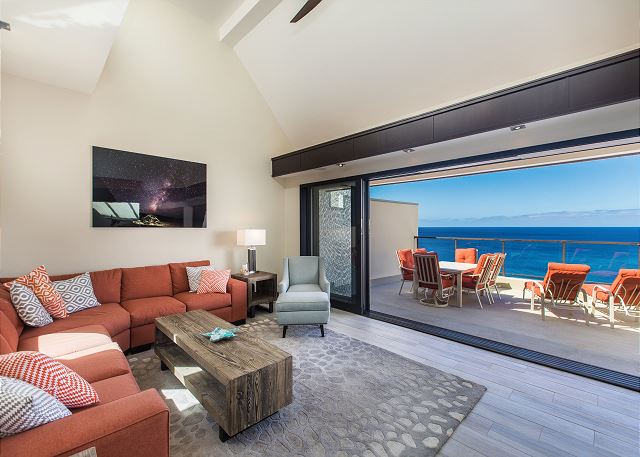 Living room features gorgeous ocean views and large screen TV with plenty of comfortable seating for major movie marathons. Past the living room is a very spacious lanai with BBQ grill, full dining set and lounge chairs. From your penthouse perch you will have the best views (and privacy.)