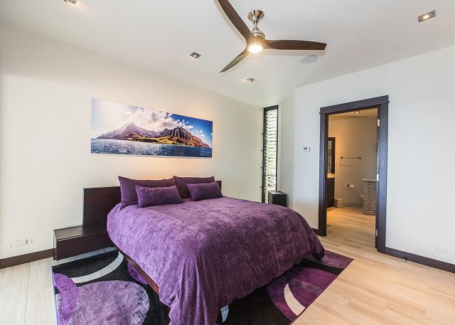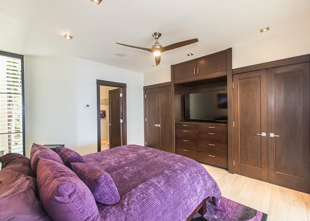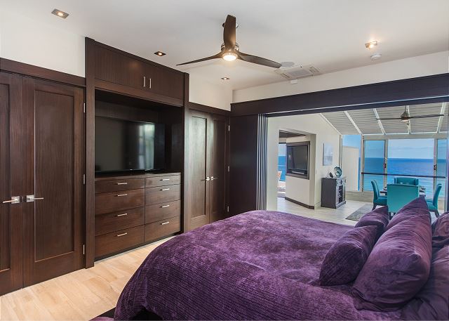 Duel master suites provide gorgeous ocean (and mountain) views and tranquil settings for deep sleep. Extremely comfortable bedding and the sound of the waves below will guide our most haggard traveler into a restorative deep sleep. Custom built Sapele closets and built-ins provide plenty of storage so you can really settle in and feel at home in elegance. Master bath features massive walk-in shower for two with rainfall, wall-mount and handheld shower heads. Duel master bath is also well appointed. Every effort was made to create the perfect spa retreat.