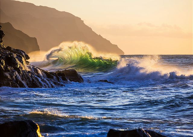 Pu’u Po’a has awesome views in almost any direction and unarguably, one of the best views on Kauai’s North Shore. You will enjoy the show from gorgeous sunrise to gorgeous sunset every day! Start your day with a cup of Hawaiian kona coffee and local tropical fruit out on your private lanai. Finish the day with cocktails while you take in the changing colors of the beautiful Pacific Ocean waters. Whatever the time of day, you may relax and enjoy the incredible and always changing panoramic views.