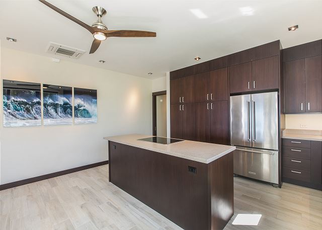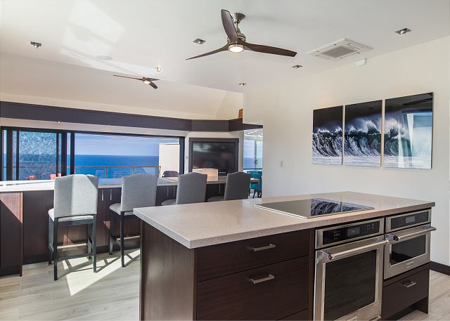 The kitchen is light and bright with gorgeous ocean and mountain views. It is spacious with plenty of room to cook and entertain. The kitchen features unique ocean facing seating perfect for family and friends to gather and celebrate being in Hawaii. Imagine watching for whales while enjoying a bite to eat in your own kitchen!