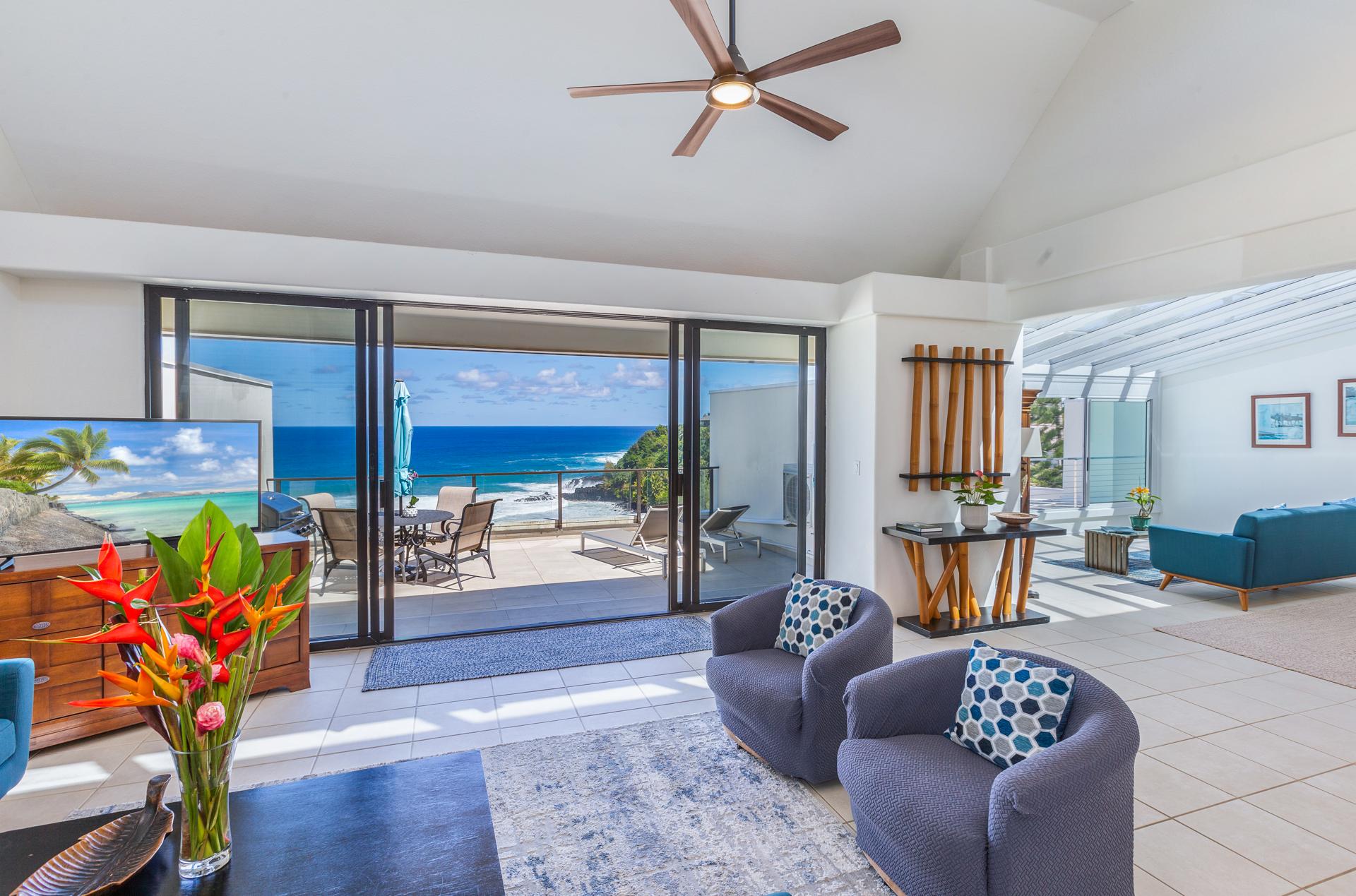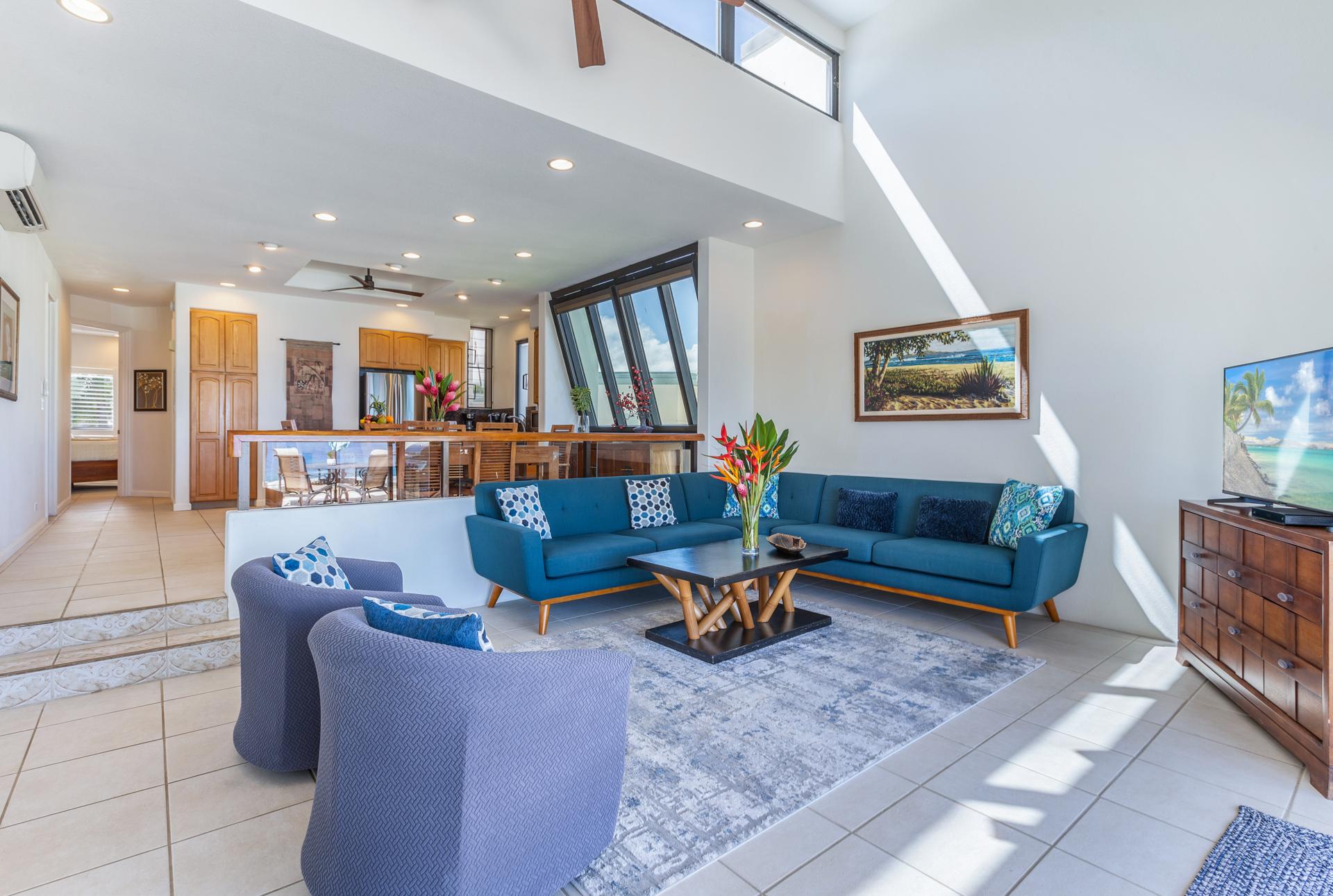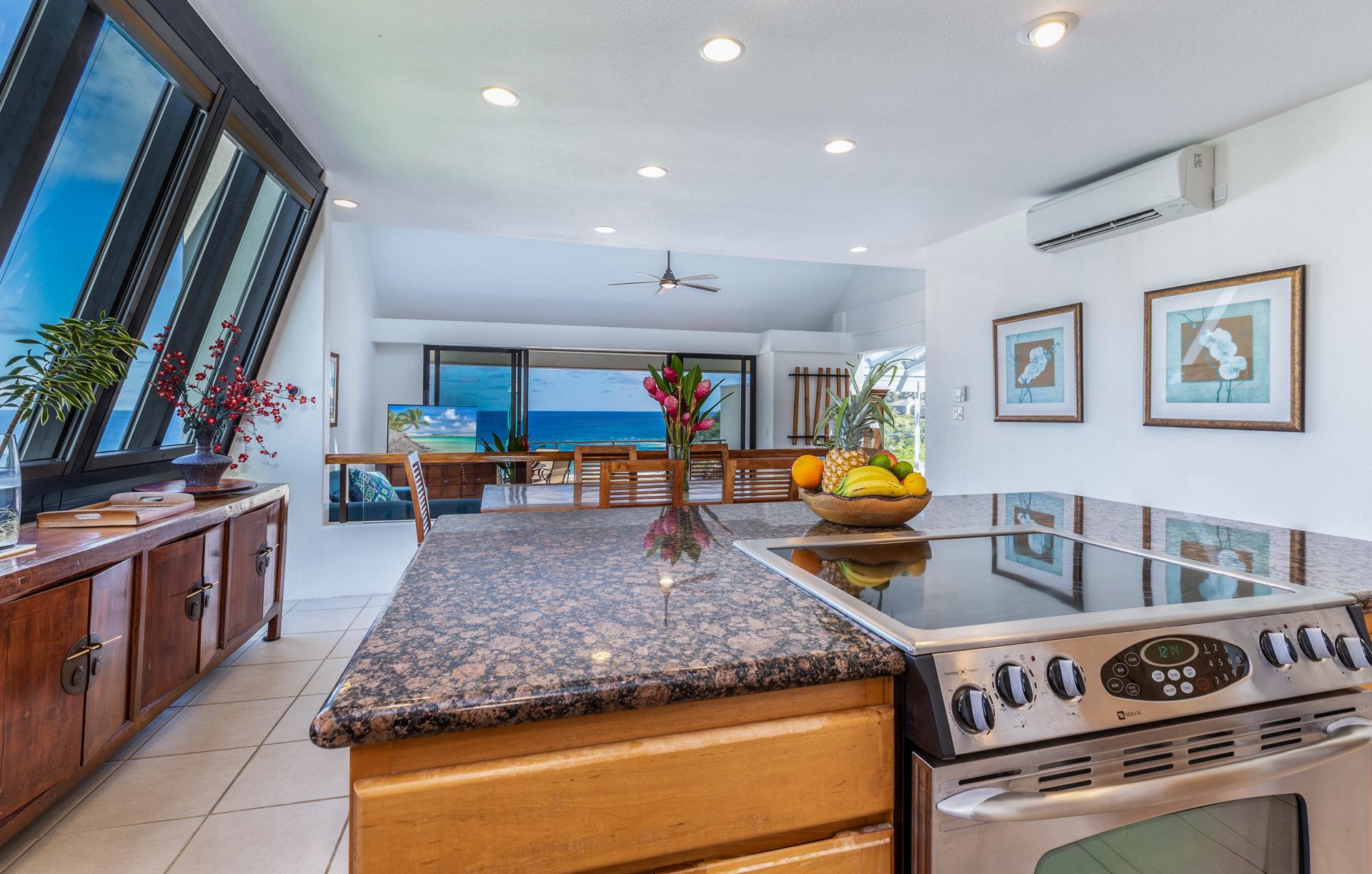 The kitchen is light and bright with gorgeous ocean views. It is spacious with plenty of room to cook and entertain. The kitchen features plenty of seating perfect for family and friends to gather and celebrate being in Hawaii. Imagine catching a glimpse of whales or dolphin while enjoying a bite to eat!