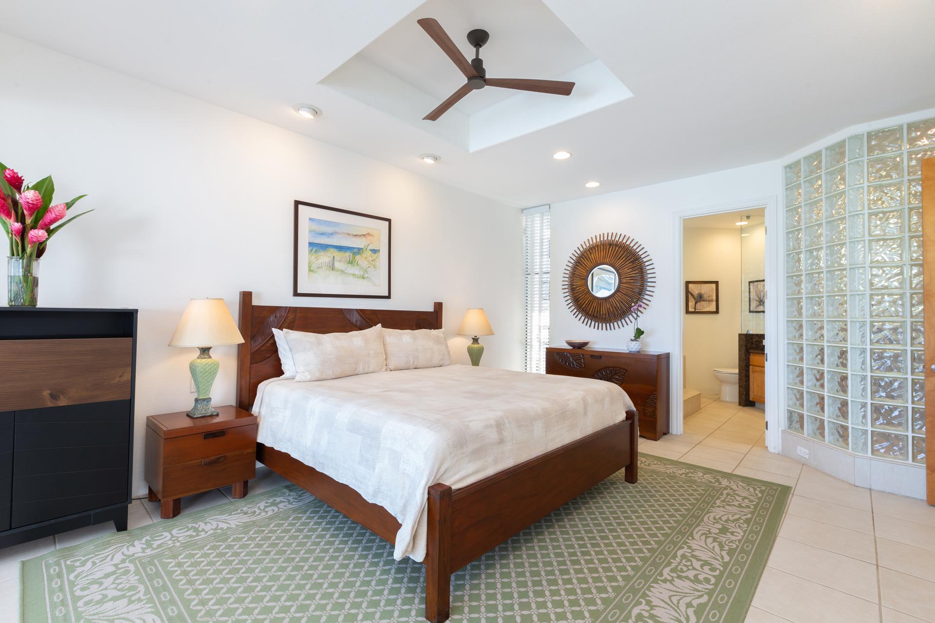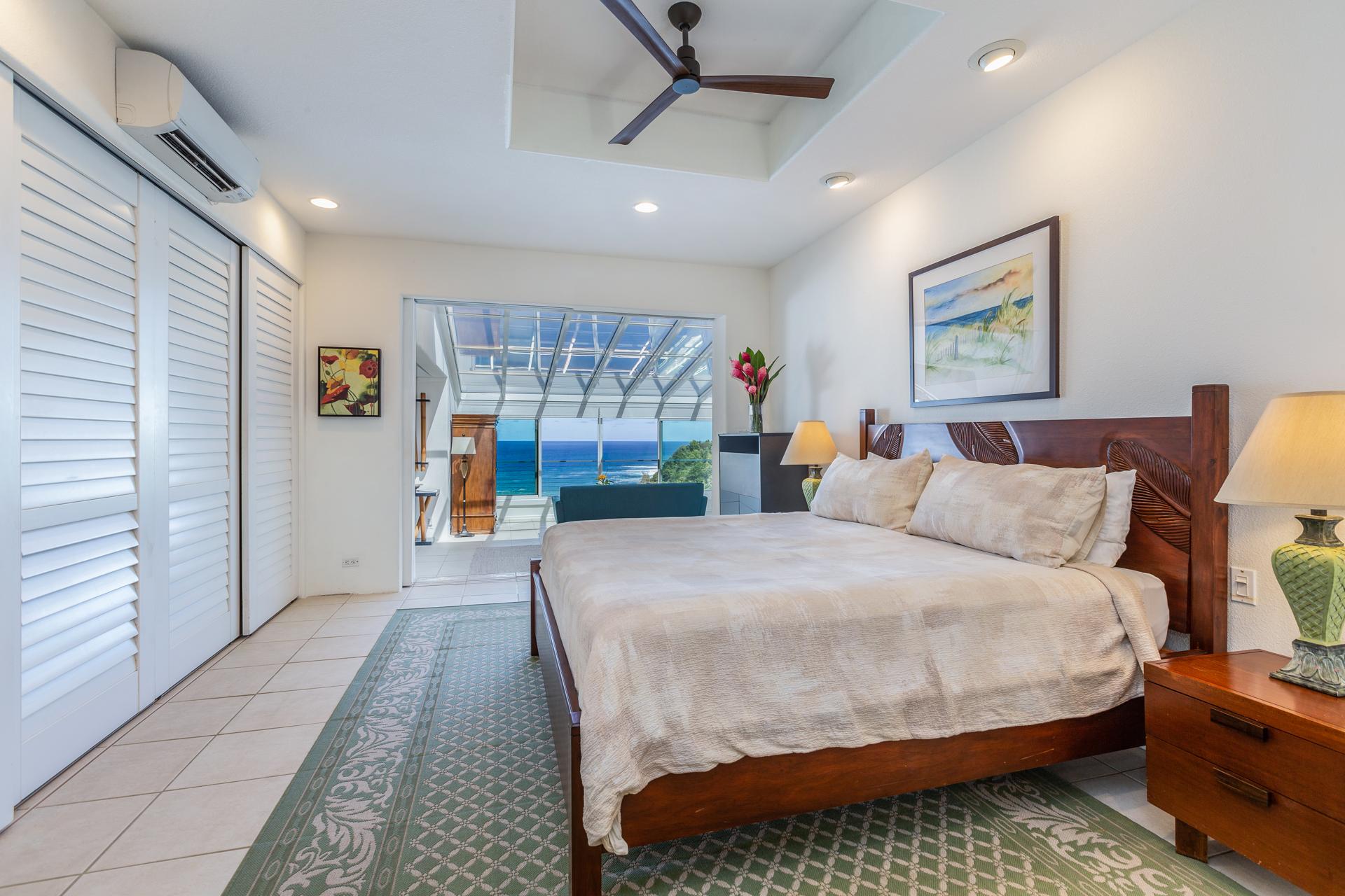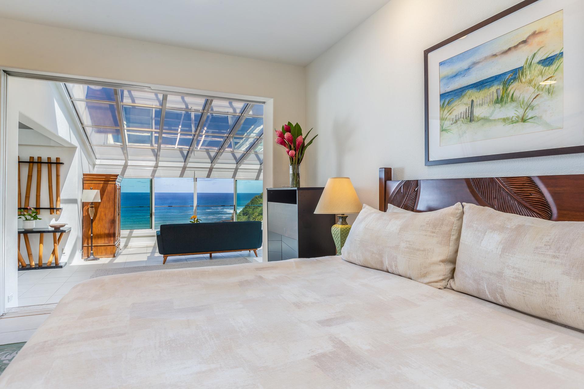 The master bedroom features a spacious Cal King size bed from which you may enjoy the spectacular ocean view. The second bedroom has a European King size bed. Your guests or family will enjoy beautiful ocean views.