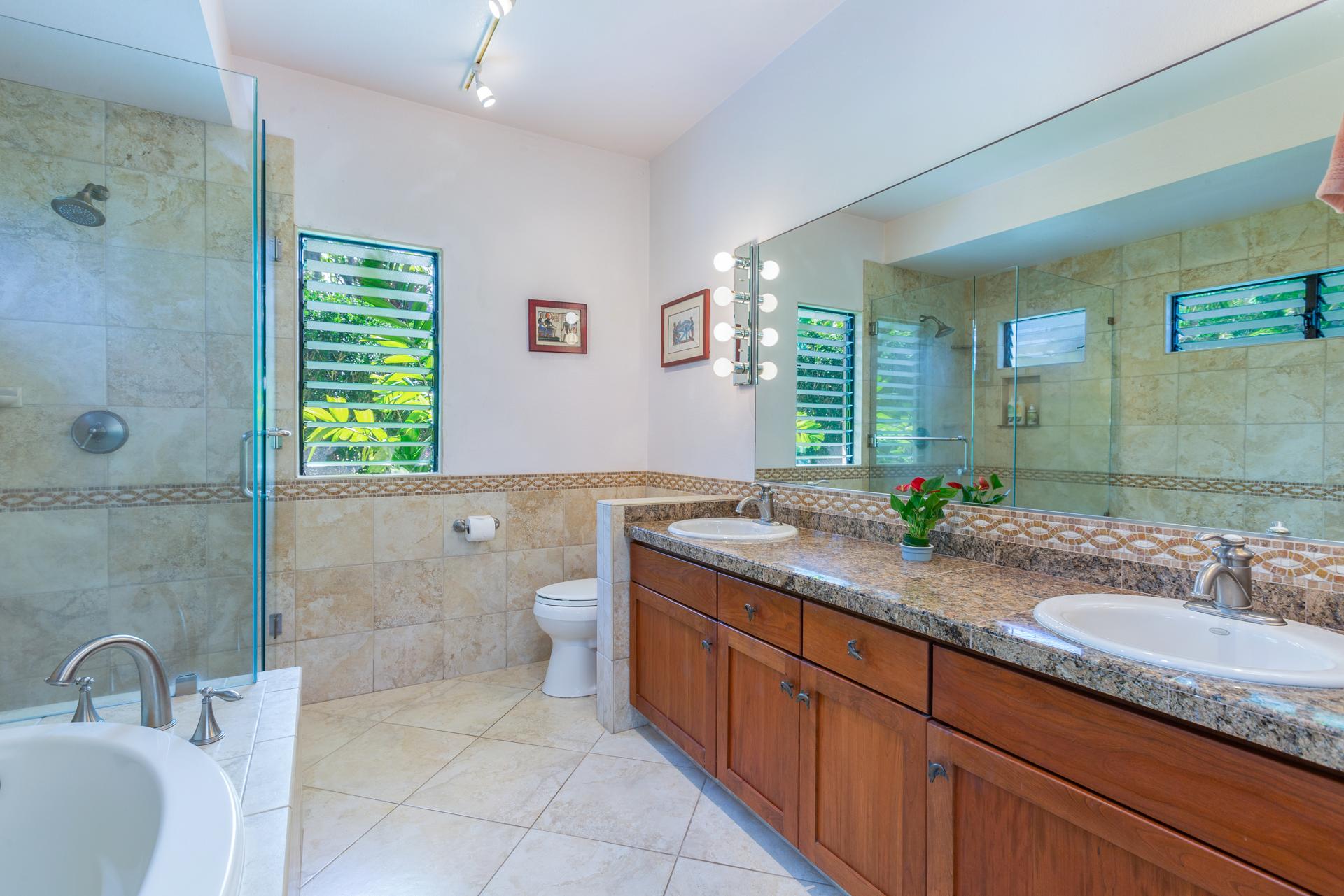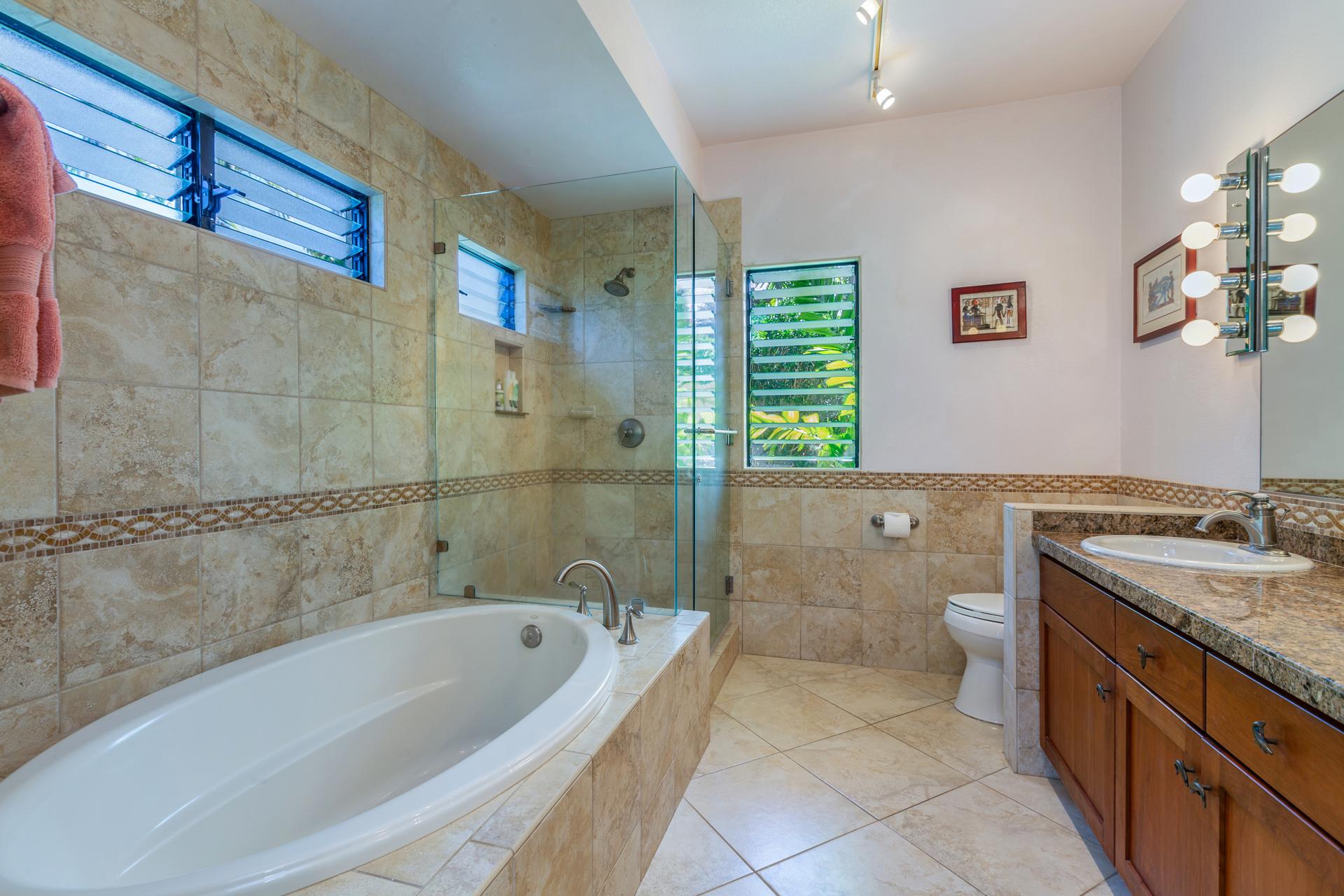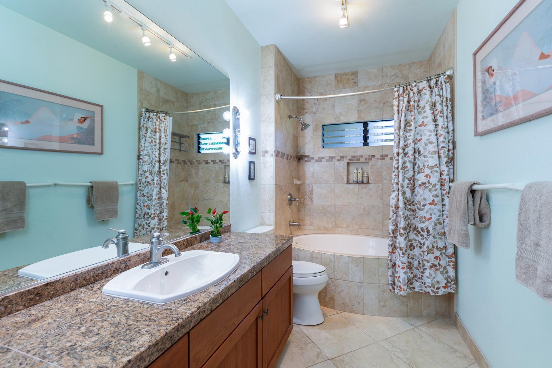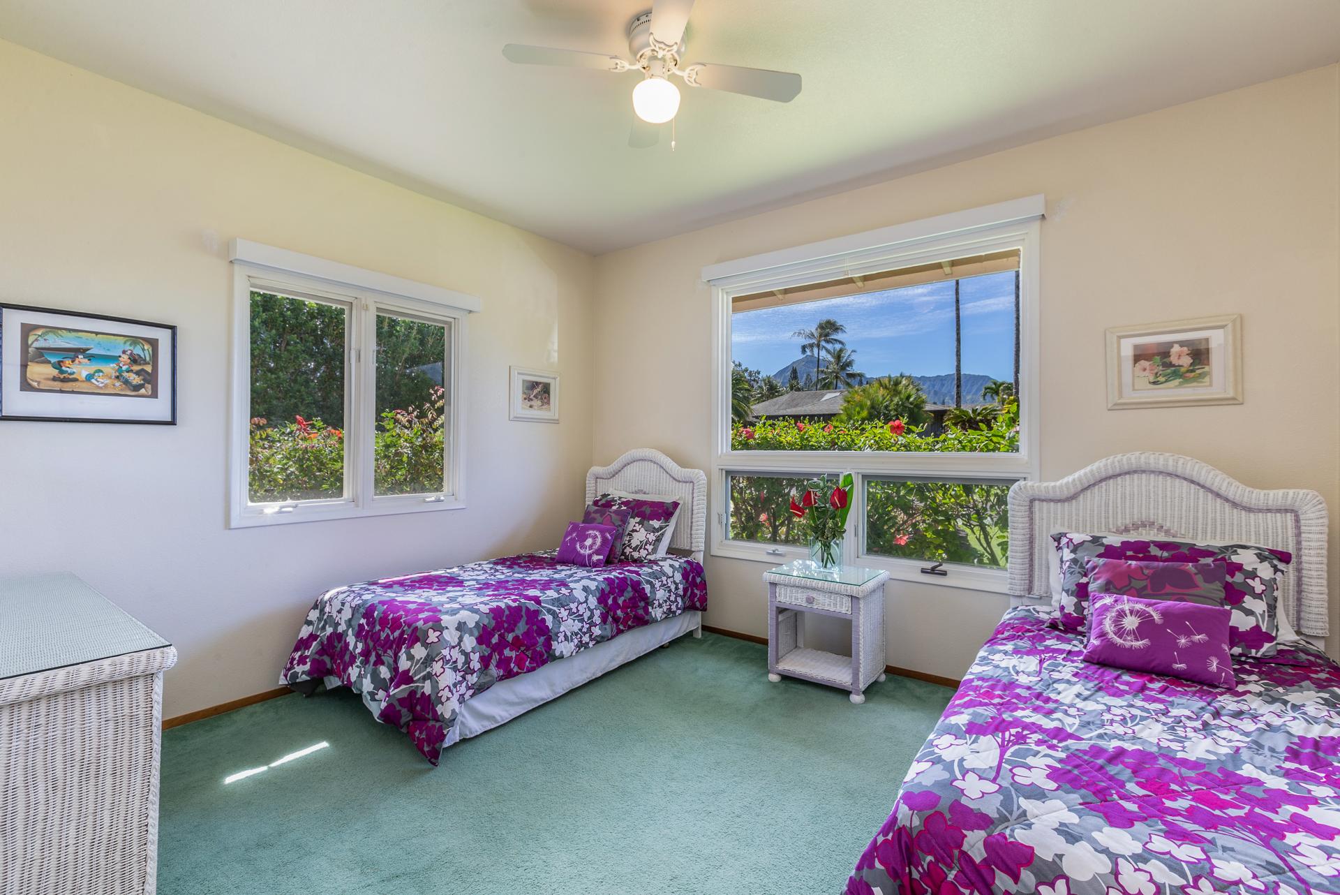 Remodeled living room features a 55” high definition TV. Master bedroom has a king-size bed with a flat screen TV and a remodeled master bathroom with oversized tub and walk in shower. The 2nd and 3rd bedrooms have queen-size beds. The fourth bedroom has 2 twin beds. There is a jog walk path along the golf course and Ka Haku Road leading to shops, restaurants, the community park, the 1 Hotel Hanalei Bay and nearby beaches.